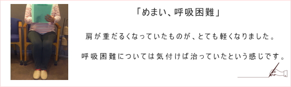 肩が重だるくなっていたものが、とても軽くなりました。呼吸困難については気付けば治っていたという感じです。
